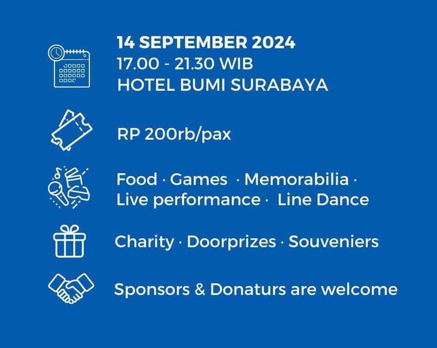 Bertempat di Hotel Bumi Surabaya lantai 3, kita akan membuat memori baru, melepas kangen, dan menjalin silaturahmi, melalui acara-acara seru yang dikreasikan panitia. Jangan ketinggalan yak, kita nggak pernah tahu kapan lagi bisa sekompak ini menyelenggarakan reuni di kemudian hari.